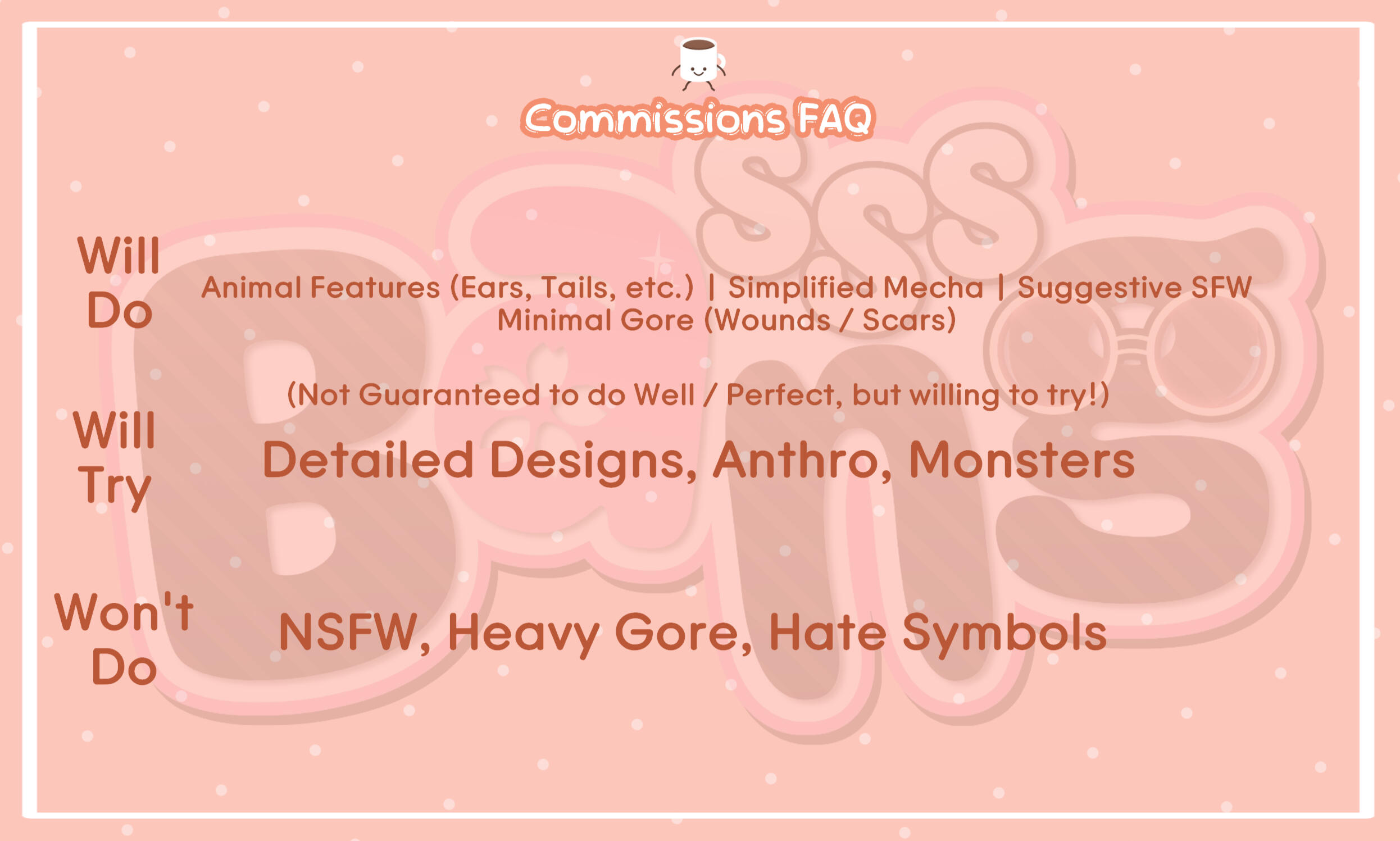 - Character Doodle Boards (20 slots)You can find the commission listings on my Ko-fi!If you are in my Discord server, you can also talk to me directly about commissions you've made, just let me or a moderator know! The Discord server also has quick info on current slots, and what you will get from commissions.Please check the FAQ below before considering commissioning!